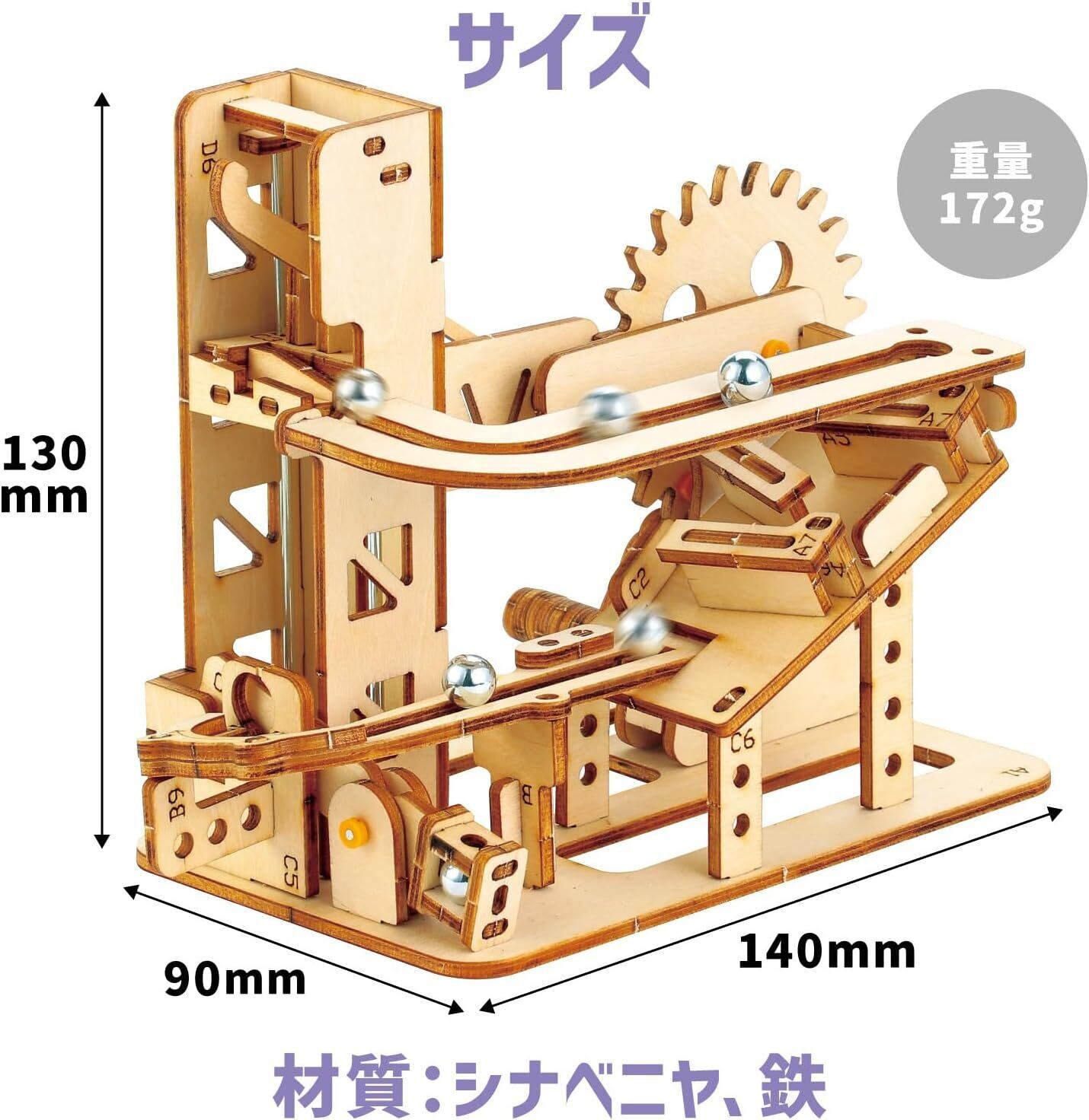 ハンドルを回すと鉄球がエレベーターをのぼって、またコースを転がります。